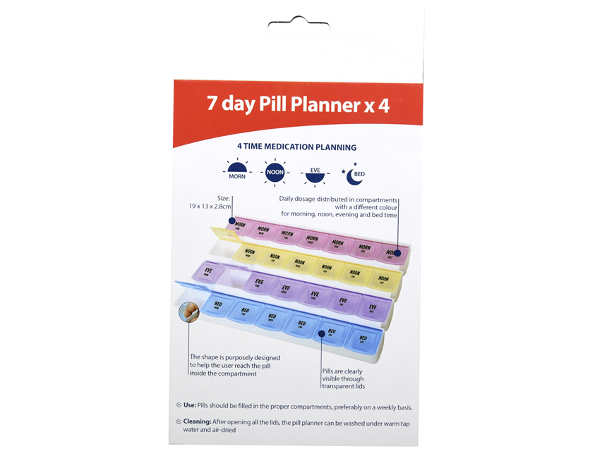 Ar 7 noņemamām 4 nodalījumiem mazām kastēm (no rīta, pusdienlaikā, vakarā un naktī). Viena kastīte katrai nedēļas dienai. Komplektā ir viens uzlīmju komplekts nodalījumu individuālai marķēšanai 11 valodās (GB, FR, IT, ES, DE, PT, PL, GR, HU, RO, SE). Caurspīdīga augšdaļa. ļauj lietotājam redzēt, vai zāles ir lietotas.