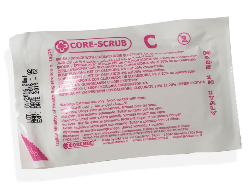 CHLOREXIDINA SCRUB KIT dispenser of 30 pcs - MultilingualLabel: GB, FR, ES, DE, PT, PL, NL, GR (blister and dispenser), PL, RU, Arabic (blister only)Italian Health Ministry registration PMC 19575With solution of Chlorhexidine Gluconate 20% 4 g in 100 mlSterile hand-cleaning hospital kit.It includes a scrub, a sponge and a plastic nail cleaner.Dry, without detergent.All scrub kits are individually blistered in 30 pieces dispenserMade in Italy.All scrub kits are individually blistered in 30 pieces dispenser.