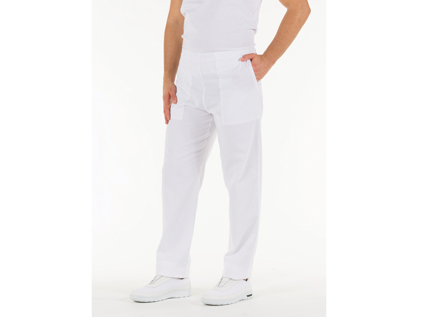 2 priekšējās kabatas un 1 aizmugurē.Elastīga jostasvieta.Unisex N1.Bikses.Baltas kokvilnas.