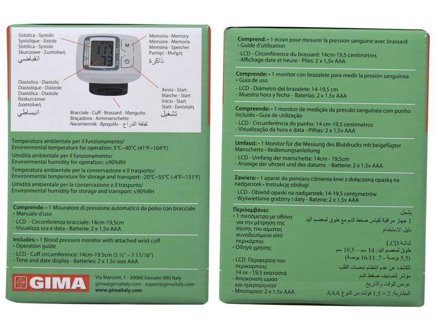 Kompakts, pilnībā loģisks asinsspiediena mērītājs ar novatoriskām funkcijām.- Viedā inflācijas tehnoloģija automātiskai sūknēšanai līdz pareizam spiedienam.- PVO asinsspiediena indikators.- IHB neregulāras sirdsdarbības noteikšana.- Pēdējo 3 rādījumu vidējā vērtība.- 2x60 atmiņas, datums un laiks.- Atsevišķi parāda sistolisko, diastolisko un pulsa ātrumu.- Daudzvalodu rokasgrāmata un kaste: GB, FR, IT, DE, ES, PT, PL, GR, arābu.Tehniskās specifikācijas.• Mērīšanas metode: oscilometriskā, automātiskā gaisa piepūšana un mērīšana.• Manžetes spiediens: 0-295 mmHg ±3 mmHg.• Pulsa frekvences diapazons: 40–180 sitieni/min ±5% no rādījuma.• Mērījumu diapazons: 30-280 mmHg.• Barošana: 2xAAA baterijas 1,5 V.• Izmēri: 84 x 64 x 28 mm.• LCD displejs: 31,9 x 39,6 mm.• Svars: 110 g (izņemot baterijas).• Plaukstas aproce: piemērota plaukstas locītavas apkārtmēriem 14-19,5 cm.