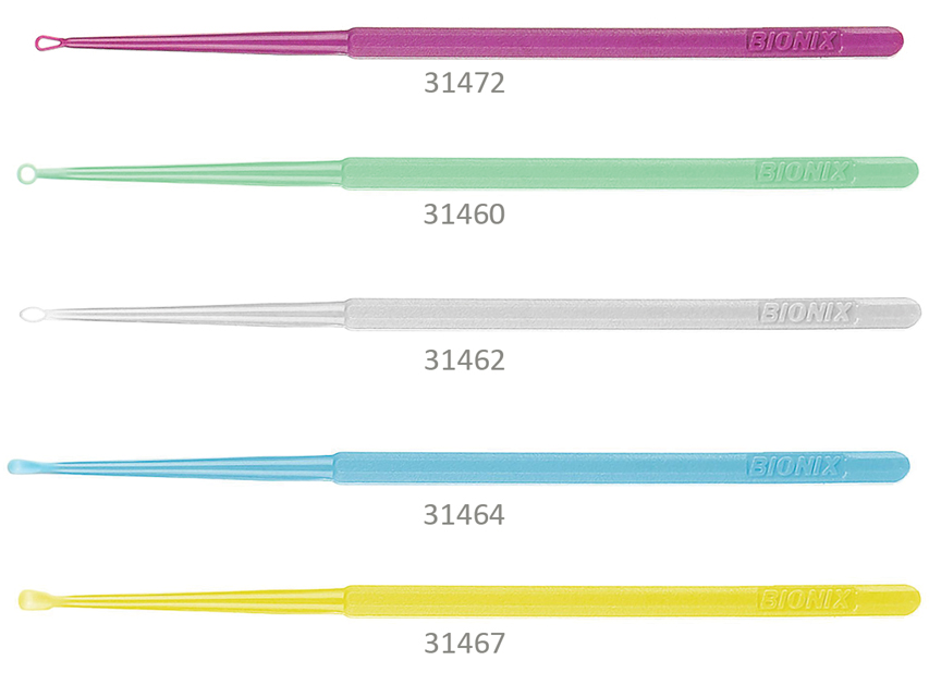 MICROLOOP kuretītes: Kompakta ausu sēra gadījumā tām ir stingrāka uzbūve. Galu var noliekt, lai palielinātu izturību. Apaļots gals ērtībai. Gals 3 mm plats. Mūsu četri kuretīšu modeļi nodrošina visefektīvāko, ekonomiskāko un drošāko veidu, kā noņemt ausu sēru. Neatkarīgi no auss izmēra vai ausu sēra konsistences. Pacienta komforts: metāla kuretītes ir aukstas, cietas un asas. BIonIx ausu kuretītes ar apaļotiem plastmasas galiem samazina traumas un plaisu risku. Nesatur lateksu. Efektivitāte: ausu kuretītes var nodrošināt metāla kuretīšu efektivitāti gandrīz jebkurā situācijā. To polipropilēna sastāvs padara tās praktiski neiznīcināmas. Vienreizlietojamība: ausu kuretītes neprasa dārgu un laikietilpīgu sterilizāciju un novērš krusteniskās kontaminācijas risku.
