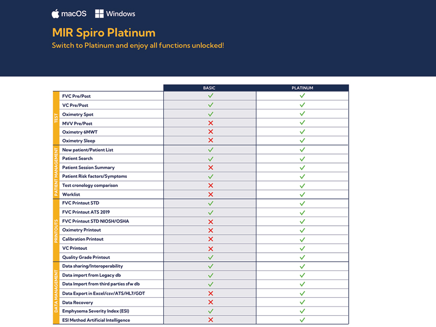 SPIROLAB® SPIROMETRS AR 7” SKĀRIENEKRĀNU.Ātrs, vienkāršs, izturīgs diagnostikas spirometrs ar Miniflowmeter.Funkcijas.- FVC, VC, MVV, PRE/POST Bronhodilatatoru salīdzinājums ar plašu atlasāmo parametru klāstu.- ilgstoša uzlādējamā baterija.- krāsains 7” skārienekrāns.- tiešs savienojums ar ārējo USB PostScript printeri.- 10 000 spirometrijas testu vai 500 stundu oksimetrijas ieraksta.- ātrs un kluss iebūvēts melnbaltais printeris ar pielāgojamu izdrukas formātu.- atlasāmas iekšējās programmatūras valodas: GB, FR, IT, ES, DE, PT.Ātri un lietotājam draudzīgi.Katru funkciju var aktivizēt ar vienkāršu pieskārienu.FlowMIR® vienreizējās lietošanas turbīna - atbilst ATS/ERS standartam.Pilnīgi vienreizlietojama (iemuts, turbīna) garantē 100% higiēnu, bez krusteniskā piesārņojuma.Nav nepieciešama kalibrēšana.Piemērots bērniem.Patentēts bērnu stimuls tieši uz ekrāna.Nav nepieciešams adapteris.MIR Spiro Basic datora programmatūra.Augstas veiktspējas datora programmatūra spirometrijai.Daudzvalodu programmatūra: GB, FR, IT, ES, DE, PT, PL, HU, RO, NL, LV, SE, CZ, RU, TR, JP, CN.Ražots Itālijā.Izmēri: 220x210x51 mm (8,66x8,26x2).Svars: 1450 g (3,1 mārciņas) (iekļauts akumulators).