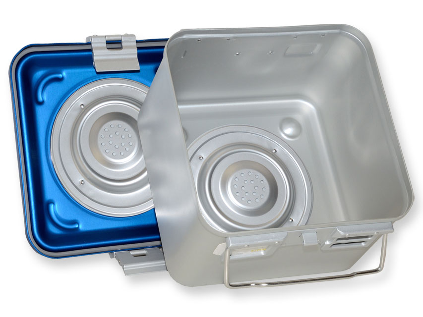 Barjeru sistēmas konteiners ar diviem vārstiem un perforētu dibenu. Barjeru sistēma ir ieteicama, ja tiek pieprasīta nepārtraukta konteineru lietošana, tā ļauj izvairīties no filtra nomaiņas. Vārsts atveras sterilizācijas laikā, lai ļautu izkļūt no tvaika.Perforētais dibens nodrošina daudz ātrāku sterilizācijas procesu (puslaiku nekā ar neperforētu).• Mazs modelis: 285 x 280 mm• Augstums: 200 mm• Perforēts dibens• Barjeru sistēma ar diviem vārstiem• Krāsa : zilsVisi konteineri ir autoklāvējami pie maksimāli 134°C un 2,2 bar. NEPĀRDOŠANA VĀCIJĀ.