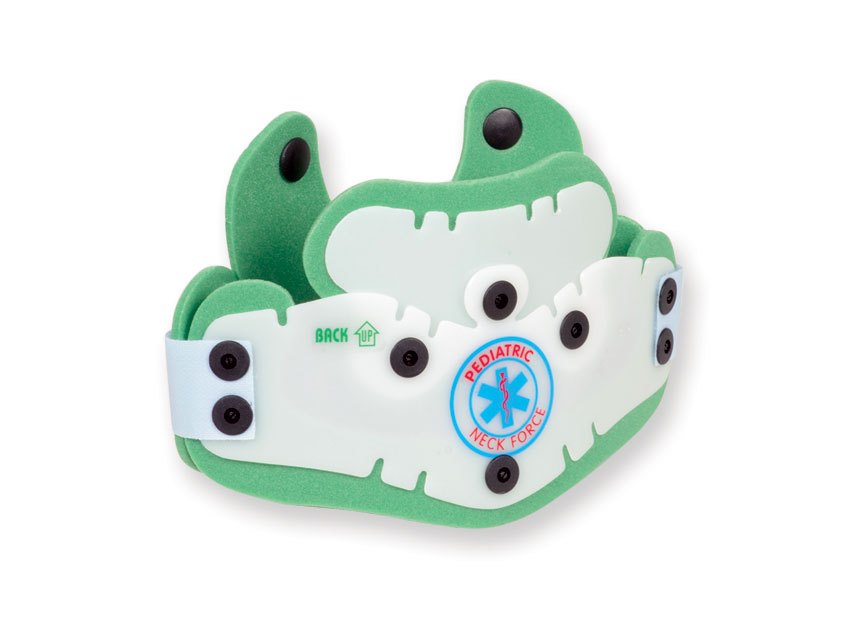 Made in polyethylene with washable internal part made in EVA (kind of rubber) fixed to structure by plastic rivets.With a tracheal hole, removable chin support and velcro fastener.X-ray translucent.Available in 6 sizes differentiated by safety closure colour or in a set of 6 in a bag.