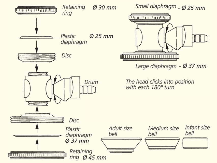 Gima Sprague Rappaport tipa dubultgalvas, dubultcaurules, lateksa nesaturošs stetoskops par standarta stetoskopa cenu.- 5 vienā, piecvirzienu konvertējams stetoskops.Šis konvertējamais stetoskops, ar cinka sakausējuma hromētu krūškurvja trumuļa stiprinājumu un dažāda izmēra krūškurvja zvaniņiem, nodrošina daudzpusīgu akustiku zīdaiņiem un pieaugušajiem, lai noteiktu plašu sirds un plaušu skaņu diapazonu.Krūškurvja trauks ar mazu un lielu diafragmu.- Dubultās caurules individuālai skaņas pārraidei.Divas 56 cm (22) bez lateksa atsevišķas biezas sienas caurules nodrošina individuālu skaņas pārraidi no krūškurvja uz abām ausīm.- Komplektā ar piederumu komplektu (32590).Tas tiek piegādāts kopā ar piederumu maciņu, kurā ir: 3 maināmi plastmasas melni zvani, kas nav atvēsināti, pieaugušo un bērnu rezerves diafragmas, viens pāris caurspīdīgu neoprēna ausu uzgaļu, viens pāris melnu sēņu ausu uzgaļu.Rokasgrāmata 10 valodās (GB, FR, DE, IT, ES, PT, GR, PL, HU, SE, RO, NL, LV, SK, arābu).Tehniskās specifikācijas.• Krāsa: zaļa.• Maza diafragma: Ø 25 mm.• Lielā diafragma: Ø 37 mm.• Galva noklikšķinās savā pozīcijā ar katru 180° pagriezienu.• Piemērots pieaugušajiem, pediatrijai un neonatoloģijai. Bez lateksa.