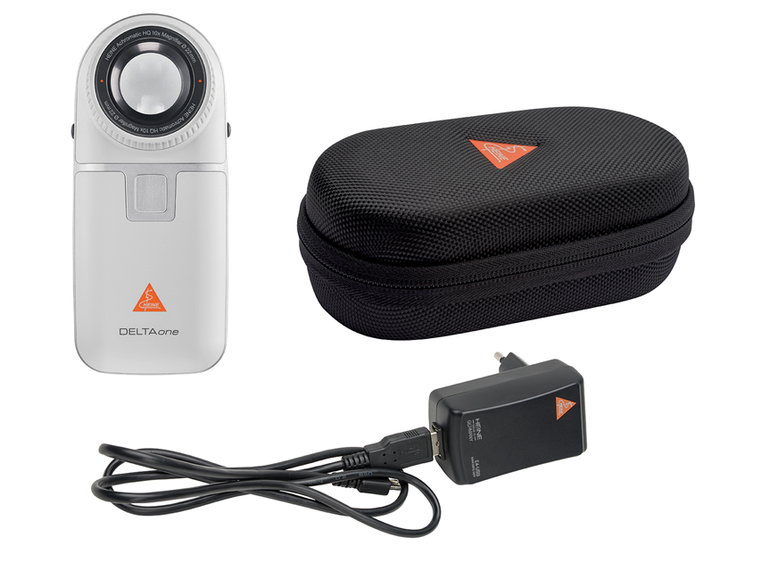 HEINE DELTAONE DERMATOSKOPS.Balts.K-211.28.305.Kabatas dermatoskops neinvazīvai īslaicīgai kontakt- un bezkontakta ādas izmeklēšanai.Nodrošina izcilu krāsu atveidi, pateicoties LEDHQ kvalitātei.Polarizācija ļauj ārstiem strādāt bez atspīdumiem un traucējošām atstarošanām.Apvieno diagnostikas precizitāti un mobilitāti.Funkcijas.- 10x palielinājums.- Ārkārtīgi ass attēls ar jauno akromātisko HEINE optisko sistēmu.- Patiesais redzes lauks Ø 21mm (objektīvs 22mm).- 3 apgaismojuma intensitātes līmeņi.- Savienojums ar bezmaksas HEINE DERM App.- Ātra pāreja no kontakt- uz bezkontakta izmeklēšanu.- Autoklavējama kontaktplāksne ar skalas atzīmēm.- Dioptriju kompensācija.- Pārslēgšanas funkcija: pārslēgšana starp polarizēto un nepolarizēto apgaismojumu, pieskaroties pogai.- Uzlādājams Li-ion akumulators.Komplektācijā.Kontaktplāksne ar skalas atzīmēm, uzlādējams Li-ion akumulators, USB barošanas avots un maciņš ar rāvējslēdzēju.