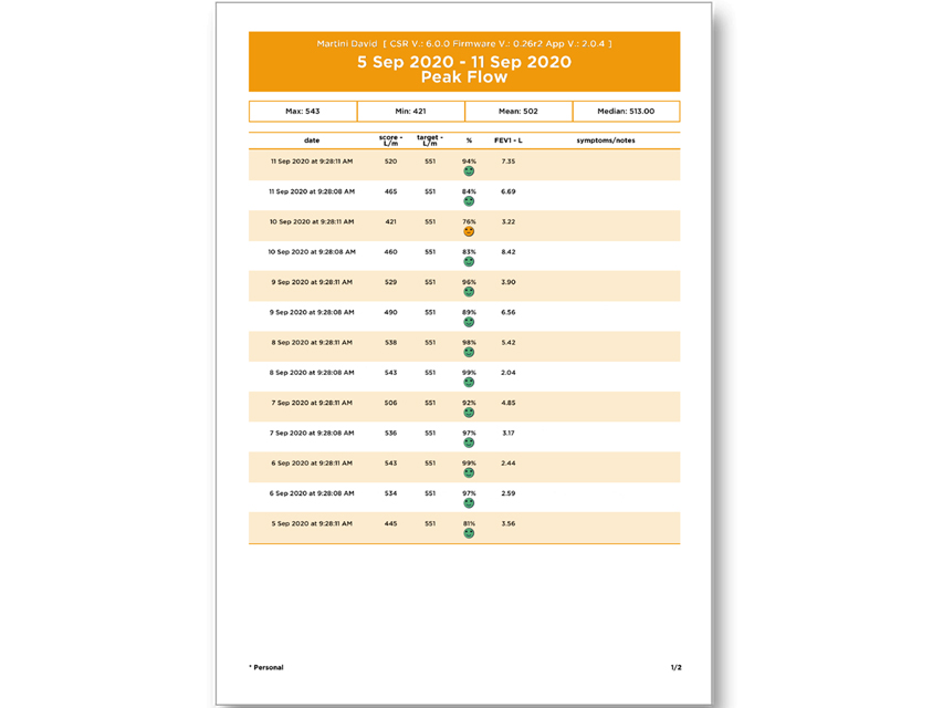 SMART ONE®.Maksimālā plūsma un FEV1.Ideāli piemērots elpceļu slimību uzraudzībai un astmas, HOPS, plaušu transplantācijas, cistiskās fibrozes ārstēšanai un izmantošanai klīniskajos pētījumos.Maksimālā plūsma un FEV1 viedtālrunī: vienkārša, ar roku turama bezvadu ierīce, ko var viegli lietot.Savienojams, izmantojot Bluetooth, ar iOS un Android viedtālruņiem un planšetdatoriem.Lietotne (GB, IT) ar ekskluzīvu stimulu pieaugušajiem un bērniem, pamatojoties uz izelpas plūsmu un apjomu, kas sniedz precīzus un noderīgus rezultātus.Pīķa plūsmas un FEV1 grafiskā tendence: mērījumi, tostarp iespēja atzīmēt jebkuru testa sesiju.Testa rezultātu vēsture ar maksimālo plūsmu, luksoforu veselības indikatoru, simptomu vērtēšanu un piezīmēm.Zems akumulatora patēriņš.Jauns turbīnas plūsmas mērītājs ar plastmasas iemuti personīgai lietošanai, kas ir viegli noņemami tīrīšanai un higiēniski.Ražots Itālijā.