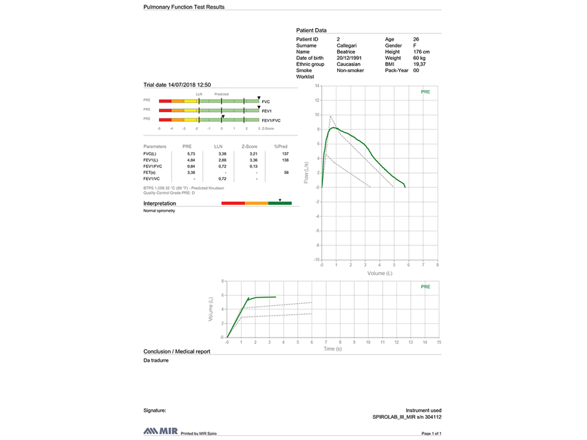 SPIROLAB® SPIROMETRS AR 7” SKĀRIENEKRĀNU.Ātrs, vienkāršs, izturīgs diagnostikas spirometrs ar Miniflowmeter.Funkcijas.- FVC, VC, MVV, PRE/POST Bronhodilatatoru salīdzinājums ar plašu atlasāmo parametru klāstu.- ilgstoša uzlādējamā baterija.- krāsains 7” skārienekrāns.- tiešs savienojums ar ārējo USB PostScript printeri.- 10 000 spirometrijas testu vai 500 stundu oksimetrijas ieraksta.- ātrs un kluss iebūvēts melnbaltais printeris ar pielāgojamu izdrukas formātu.- atlasāmas iekšējās programmatūras valodas: GB, FR, IT, ES, DE, PT.Ātri un lietotājam draudzīgi.Katru funkciju var aktivizēt ar vienkāršu pieskārienu.FlowMIR® vienreizējās lietošanas turbīna - atbilst ATS/ERS standartam.Pilnīgi vienreizlietojama (iemuts, turbīna) garantē 100% higiēnu, bez krusteniskā piesārņojuma.Nav nepieciešama kalibrēšana.Piemērots bērniem.Patentēts bērnu stimuls tieši uz ekrāna.Nav nepieciešams adapteris.MIR Spiro Basic datora programmatūra.Augstas veiktspējas datora programmatūra spirometrijai.Daudzvalodu programmatūra: GB, FR, IT, ES, DE, PT, PL, HU, RO, NL, LV, SE, CZ, RU, TR, JP, CN.Ražots Itālijā.Izmēri: 220x210x51 mm (8,66x8,26x2).Svars: 1450 g (3,1 mārciņas) (iekļauts akumulators).